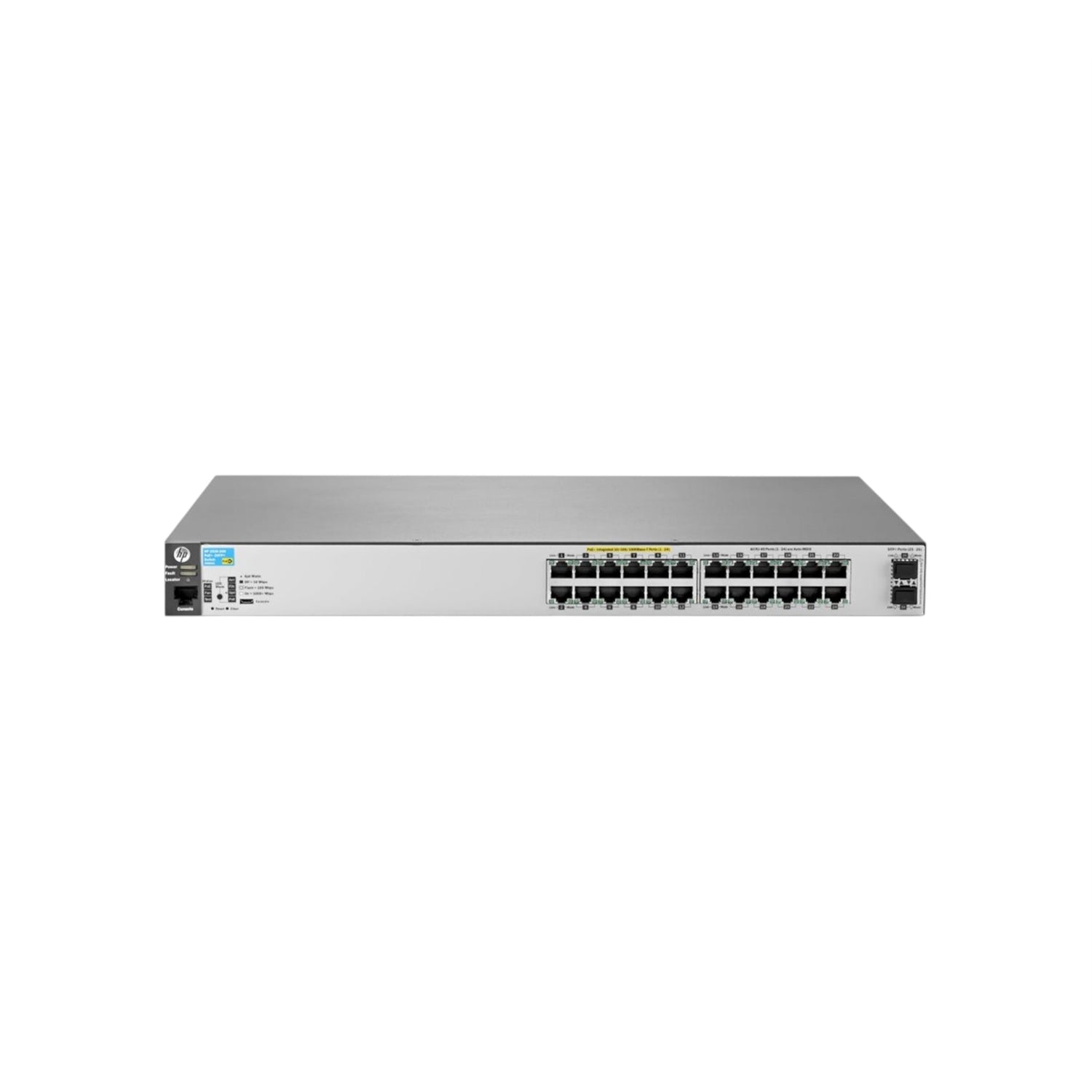The J9854A is part of the Aruba 2530 Series — it’s a managed Layer‑2 switch. It has 24 × Gigabit RJ‑45 PoE+ ports (10/100/1000 Mbps) with IEEE 802.3at support. Uplink ports: 2 × 10 Gb SFP+ (fixed) for high-speed uplink / aggregation. Management / Console: includes a dual‑personality serial port (RJ‑45 or USB micro‑B).